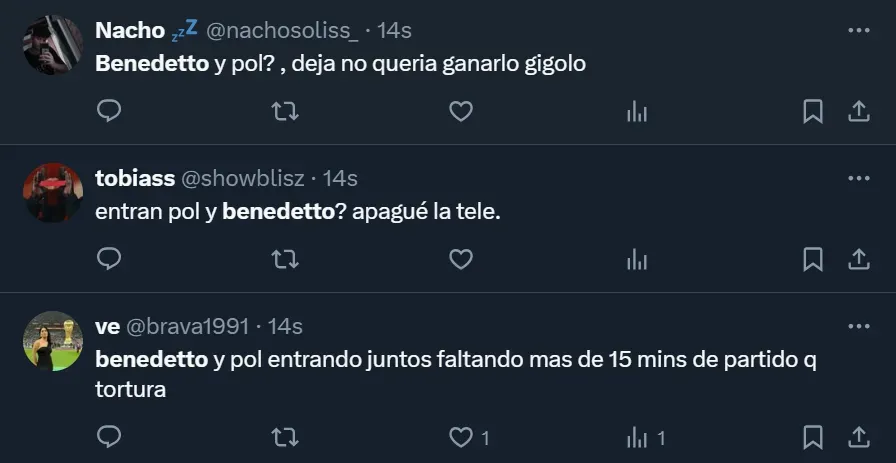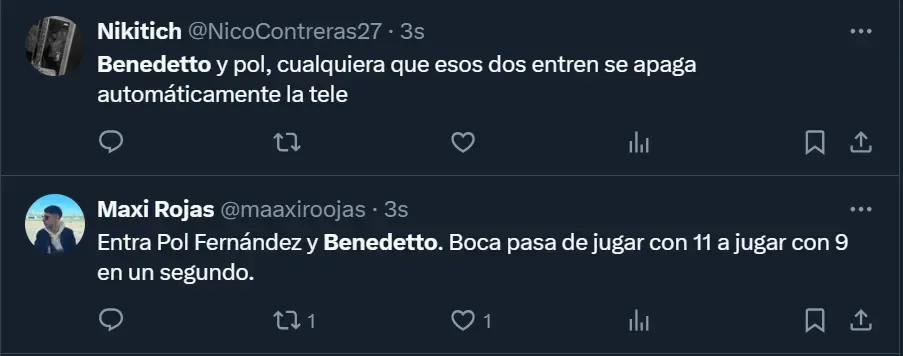 No es la primera vez que a Benedetto lo critican desde las tribunas virtuales, algo que también ha ocurrido, en menor medida, en el Alberto J. Armando. Pese a las críticas, el Pipa tuvo un ingreso aceptable, no desentonó y participó de la jugada que derivó en el gol de Miguel Merentiel, que sirvió para el triunfo sobre el final.