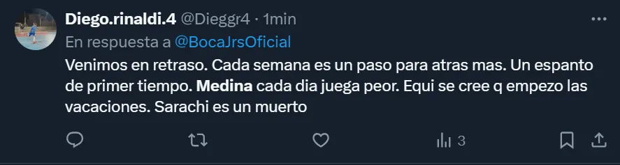 Así como en más de una ocasión los fanáticos del Xeneize criticaron el rendimiento de Pol Fernández, de Frank Fabra y también de Darío Benedetto, quien recibió el cuestionamiento popular fue Cristian Medina, que no tuvo una actuación aceptable y los hinchas se lo hicieron saber.