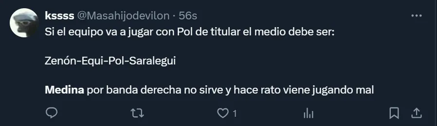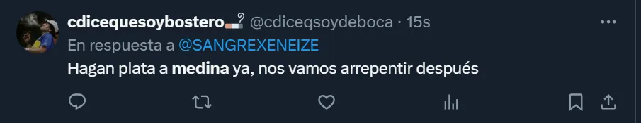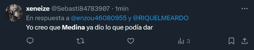 Así como hubo simpatizantes que solicitaron que “hagan plata a Medina ya, nos vamos a arrepentir después”, hubo otros que en Twitter sostuvieron que “Medina ya dio lo que podía dar”, haciendo referencia a que el futbolista de 22 años llegó a su techo.
