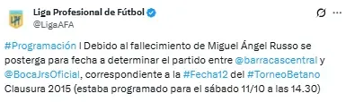 “El Club Atlético Barracas Central, en nombre de su presidente Matías Fabián Tapia, quiere hacer llegar el mayor de los respetos y condolencias a la familia y amigos del señor Miguel Ángel Russo, ante la tristísima noticia de su partida”, comenzó el comunicado del Guapo.