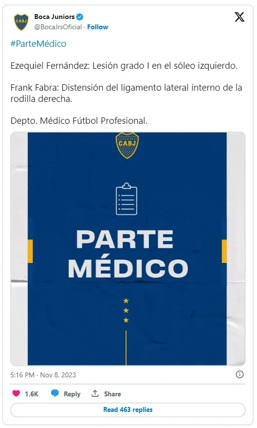 El Xeneize informó que dos de sus titulares se lesionaron en la final de la CONMEBOL Libertadores. Ezequiel Fernández sufrió una lesión de grado I en el sóleo izquierdo, mientras que Frank Fabra tiene una distensión del ligamento lateral interno de la rodilla derecha. Ambos, descartados para el fin de semana.