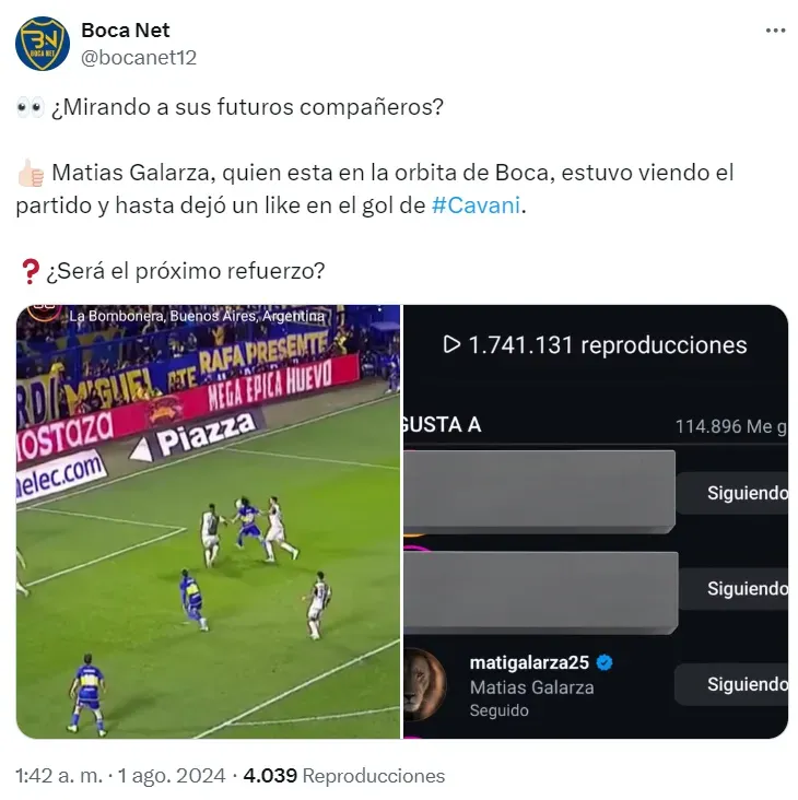 A la distancia, quien se mostró viendo el partido fue Matías Galarza, el volante del Genk que está haciendo todo lo que tiene a su alcance para destrabar su salida. A través de Instagram, el jugador se despachó con un me gusta a un video del gol de Edinson Cavani, que abrió la cuenta ante el Taladro.