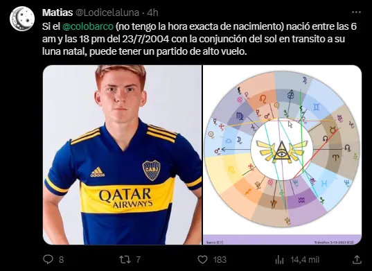 Armas no fue el único astrólogo que se animó a presagiar algo, sino que también otro profesional en la materia conocido por sus predicciones deportivas se hizo presente en las redes sociales y vaticinó un pronóstico para Valentín Barco y su desempeño en el encuentro frente a Palmeiras.