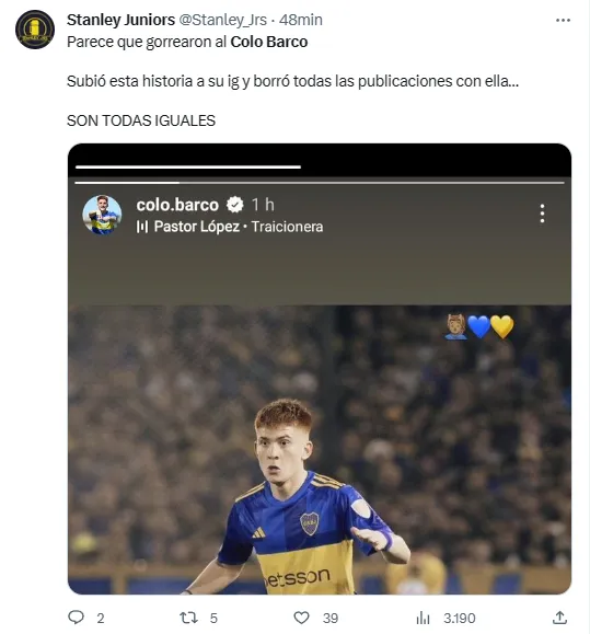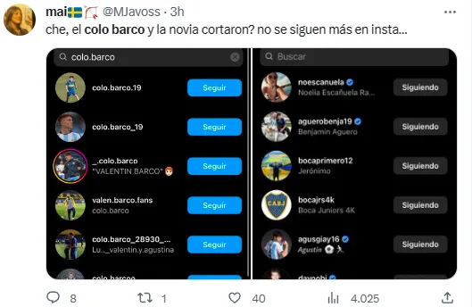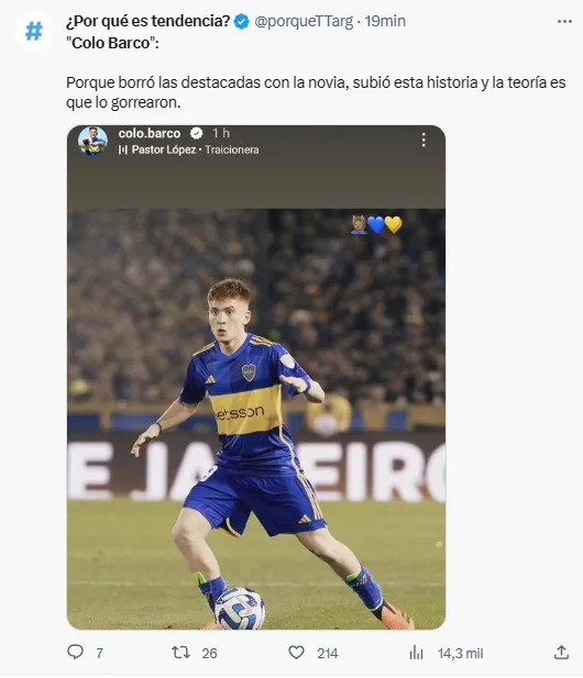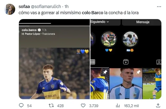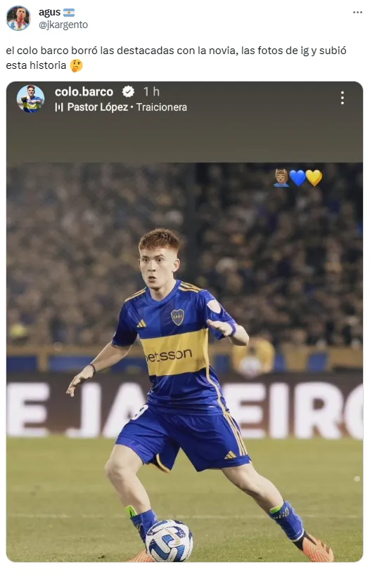 Para colmo, varios usuarios en Twitter advirtieron que Barco eliminó todas las historias destacadas que tenía junto a su novia Agustina Sequeira e hicieron el nexo con una presunta ruptura del vínculo amoroso que mantenía desde hace tiempo. Así se comentó el rumor en redes: