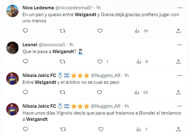 “Qué tipo burro que es Weigandt loco”, “Entre Weigandt y el árbitro no se cual es peor”, “que burro sos weigandt”, son algunos de los tantos comentarios criticando al lateral derecho.