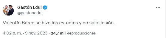 “Valentín Barco se hizo los estudios y no salió lesión”, adelantó esta tarde Gastón Edul, devolviéndole el alma al cuerpo del Xeneize. De esta manera, Herrón podrá contar con el joven talento para los compromisos del final del año.