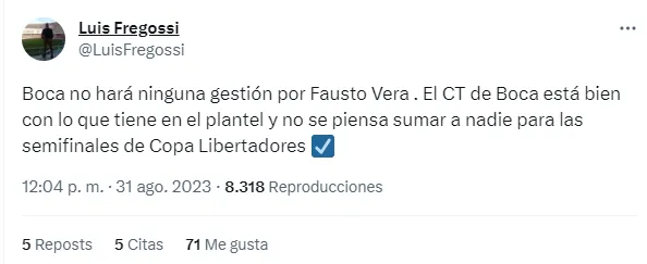 Acorde a esto, el periodista Luis Fregossi, salió a desmentir el rumor, y en su cuenta de Twitter explicó: “Boca no hará ninguna gestión por Fausto Vera . El CT de Boca está bien con lo que tiene en el plantel y no se piensa sumar a nadie para las semifinales de Copa Libertadores”.