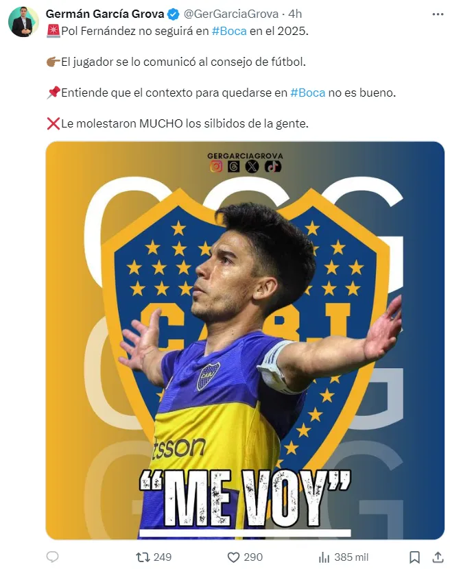 Además, el periodista agregó que el volante “entiende que el contexto para quedarse en Boca no es bueno”. De esta manera, no habrá Pol Fernández en 2025 para el club de la Ribera, que deberá buscar a un reemplazante tanto para lo futbolístico como para el vestuario.