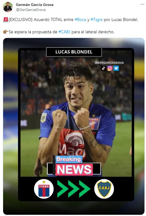 Tal y como informó el periodista Germán García Grova, Boca ya tiene la aprobación de Tigre para avanzar en el fichaje de Lucas Blondel y ahora solo resta que le presente una oferta al futbolista, habiendo un enorme optimismo en relación a su respuesta.