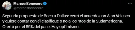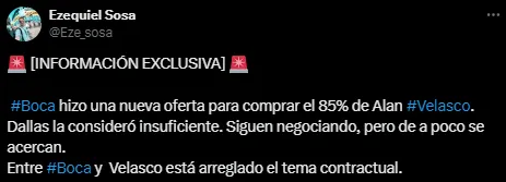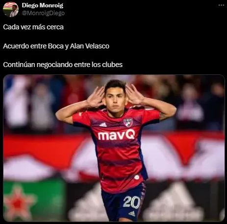 Es que, por la noche, trascendió que Boca Juniors está cerca de completar otro fichaje impactante para el medio local. Tras la victoria ante San Lorenzo en La Bombonera, varios de los periodistas que cubren el día a día del Xeneize coincidieron en que Alan Velasco está muy cerca.