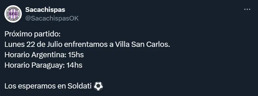 El lunes 22 de julio deberán recibir a Villa San Carlos tras la igualdad contra Sportivo Italiano. Y en X (ex Twitter) fueron muy directos: “Próximo partido: Lunes 22 de julio enfrentamos a Villa San Carlos. Horario Argentina: 15hs. Horario Paraguay: 14hs. Los esperamos en Soldati”, escribieron para referirse al huso horario del país limítrofe en donde se encuentra la sede de CONMEBOL, quien se encarga de recibir la documentación correspondiente para la competición continental.