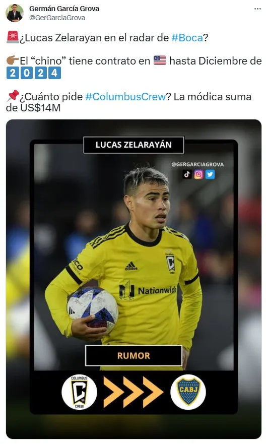 Según pudo confirmar el periodista de TyC Sports, Germán García Grova, Columbus Crew ya tomó una postura con respecto a una posible venta de Zelarayán: piden alrededor de 14 millones de dólares para desprenderse del volante, cifras que parecen inalcanzables para cualquier equipo del fútbol argentino, incluso para Boca. Es por eso que prácticamente habría que descartar la llegada del cordobés a la institución de La Ribera.