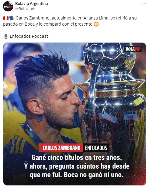 Se trató de una entrevista en Enfocados Podcast, de su país, en la que bromeó con el palmarés del Xeneize desde que salió del equipo. Zambrano mencionó lo que pudo ganar con el elenco de La Ribera y lo comparó con las celebraciones desde entonces.