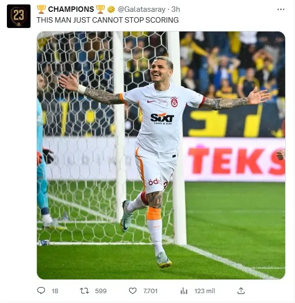 Hoy fue un día especial en la vida deportiva de Mauro Icardi. Con un impresionante doblete del argentino, el Galatasaray venció al Ankaragucu por 4-1 y levantó su 21° trofeo de Superliga de Turquía a falta de dos jornadas para el cierre del campeonato. 21 goles en 23 partidos completan una temporada excepcional del ex Inter, que parece haber recuperado toda la confianza en el fútbol europeo.