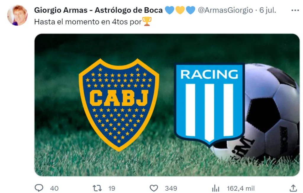 Sin dar muchas vueltas, Armas fue contundente en su cuenta de Twitter: “¡Boca elimina a Racing!”. Según él, serán los dirigidos por Jorge Almirón quienes avanzarán de instancia en la competencia internacional. ¿Se cumplirá?