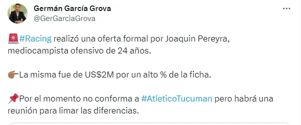 En las últimas horas, salió una competencia para el Xeneize, ya que Racing también está interesado en los servicios del volante, y acorde a lo que informa el periodista Germán García Grova, realizó una oferta formal de 2 millones de dólares por un alto porcentaje de su pase, y si bien no conforma al equipo tucumano, habrá una reunión para limar las diferencias.
