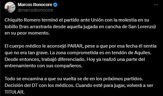 Desde ese momento, Romero se encuentra haciendo entrenamientos diferenciados al resto del grupo y se lo espera 100% para los próximos días, ya que este domingo, en la práctica posterior al triunfo frente a Newell’s, Chiquito ya hizo una parte del ensayo a la par del plantel. Diego Martínez, bajo la tutela de los médicos, decidirá cuándo el misionero esté apto para regresar. Cuando lo haga, será nuevamente el dueño del arco. Por lo pronto, en Boca no le ponen plazos a su recuperación porque priorizan que la misma se haga correctamente.
