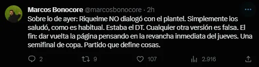 El periodista Marcos Bonocore fue el encargado de revelarlo en sus redes sociales. “Sobre lo de ayer: Riquelme no dialogó con el plantel. Simplemente los saludó, como es habitual. Estaba el DT. Cualquier otra versión es falsa. El fin: dar vuelta la página pensando en la revancha inmediata del jueves. Una semifinal de copa. Partido que define cosas“, informó y destacó el jornalista desde su cuenta de Twitter. Además, el colega Diego Monroig en ESPN confirmó que esto fue lo que verdaderamente ocurrió, por lo que el mensaje del vicepresidente de Boca fue de aliento y de cambio de página para el plantel xeneize, que ya comenzó este lunes a preparar todos los detalles para enfrentar a Palmeiras este jueves en Sao Paulo.