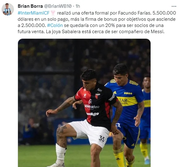 Según informa el periodista Brian Borra, el nuevo equipo de Messi realizó una oferta formal por Facundo Farías. 5.500.000 dólares en un solo pago, más la firma de bonus por objetivos que asciende a 2.500.000, dejándole a Colón un 20% para ser socios de una futura venta, por lo que está cerca de darse la operación.