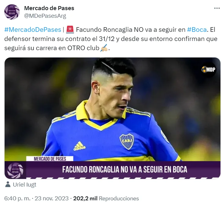 Finalmente, trascendió que el zaguero no renovará su vínculo y se irá cuando termine el año. De esta manera, Boca se saca de encima a un jugador importante para el vestuario pero con un bajísimo rendimiento dentro del campo de juego. A sus 36 años, Roncaglia buscará continuidad en otro club.