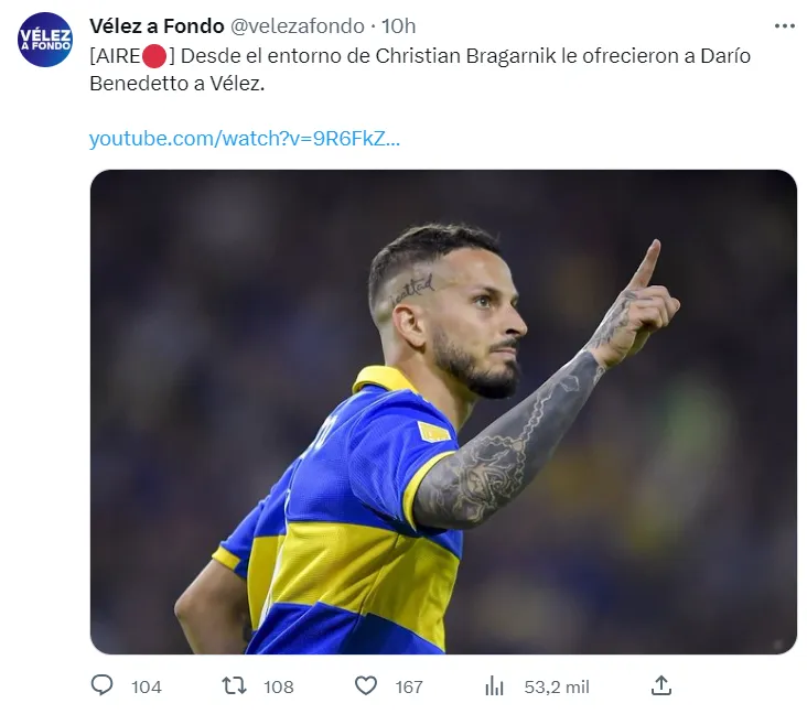 “Desde el entorno de Christian Bragarnik le ofrecieron a Darío Benedetto a Vélez”, informó el medio Vélez a Fondo. El Fortín, que se encuentra más que complicado en la tabla de posiciones, busca renovarse y tiene la posibilidad del Pipa sobre la mesa. De todas formas, parece difícil que se dé.