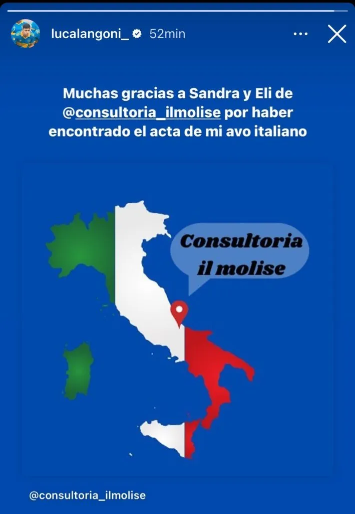 En su cuenta personal de Instagram, Langoni le agradeció a una empresa por haber encontrado el acta de nacimiento de su ancestro, un papel importante para quiénes inician el trámite para conseguir la ciudadanía italiana.
