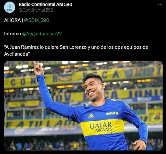 En Radio Continental, el periodista Augusto César informó que hay dos equipos interesados en contar con Juan Ramírez debido a su situación en Boca. En concreto, el jornalista aclaró que San Lorenzo busca repatriarlo y, en paralelo, uno de los dos clubes de Avellaneda también. Y si bien no se develó el equipo entre Racing e Independiente que buscan al jugador del Xeneize, en anteriores ocasiones fue ofrecido al Rojo, por lo que podría tratarse del equipo de Carlos Tevez el que está detrás de Ramírez junto con San Lorenzo.