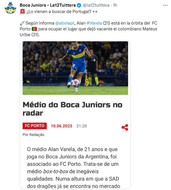Según informó el portal portugués A Bola, el entrenador del Porto, Sérgio Conceição, quiere llevarse a uno de los futbolistas más queridos por el hincha de Boca. “Ya hay algunos nombres carpeta, como el mediocampista de 21 años Alan Varela, que juega para el Boca Juniors de Argentina. Se trata de un box-to-box de innegable calidad, cuyo valor de mercado es de 10 millones de euros”, detalló el medio digital.