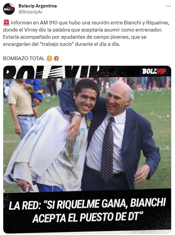 “La información que tengo confirmada por dos lados diferentes es que la semana pasada Riquelme, y parte del Consejo de Fútbol de Boca, mantuvo una extensa reunión con Carlos Bianchi y le dio la palabra de que si Riquelme gana, va a aceptar el desafío de volver a dirigir a Boca”, informó el periodista en la reconocida emisora radial para la sorpresa de todos.