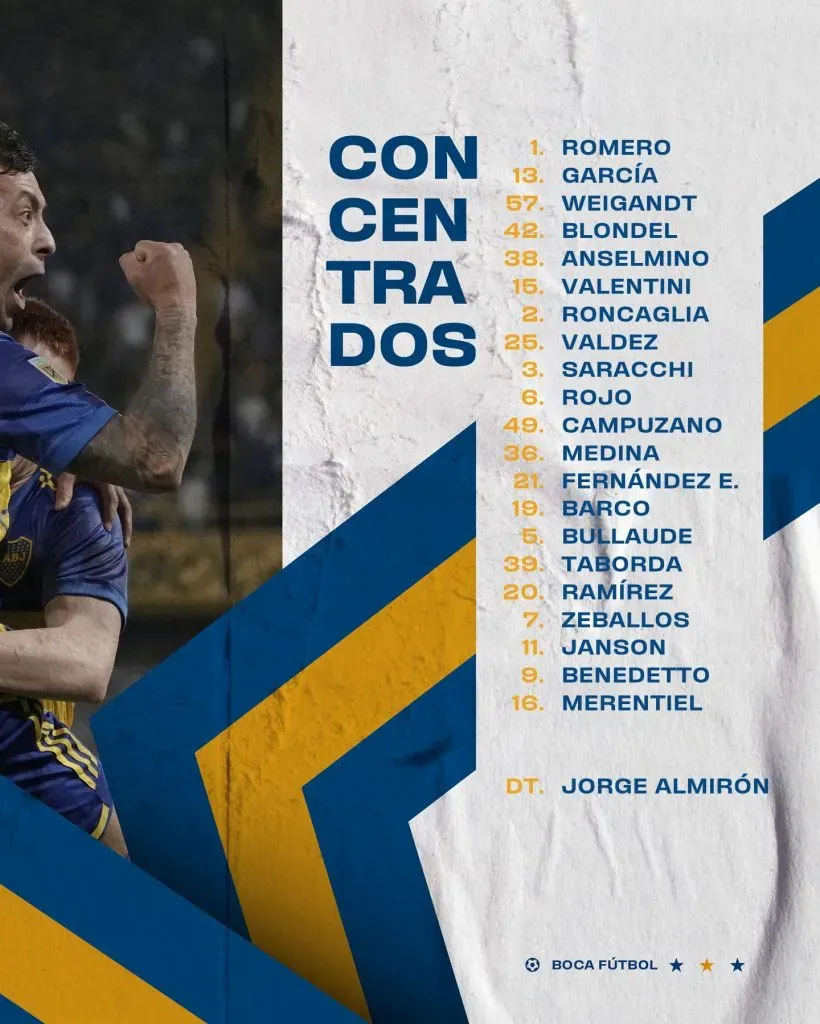 En esta convocatoria, hay algunas ausencias de renombre, ya que Almirón decidió darle descanso a Nicolás Figal, quien llegó tocado al duelo con Palmeiras, así como también a Edinson Cavani, Frank Fabra y Pol Fernández. Si bien se pensaba que Rojo iba a seguir los mismos pasos, finalmente aparece en la nómina.