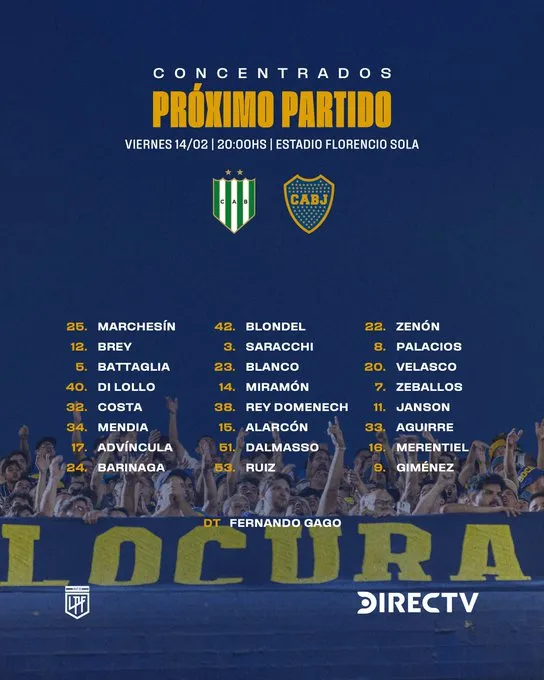 El calendario del fútbol argentino no da descanso, y a poco menos de 72 horas del triunfo ante Independiente Rivadavia en La Bombonera, Boca deberá cruzarse con Banfield este viernes en el Estadio Florencio Sola desde las 20 horas. Para dicho compromiso, Fernando Gago dio a los 24 convocados que buscarán una nueva victoria para el Xeneize en la previa del debut en la Copa Libertadores.