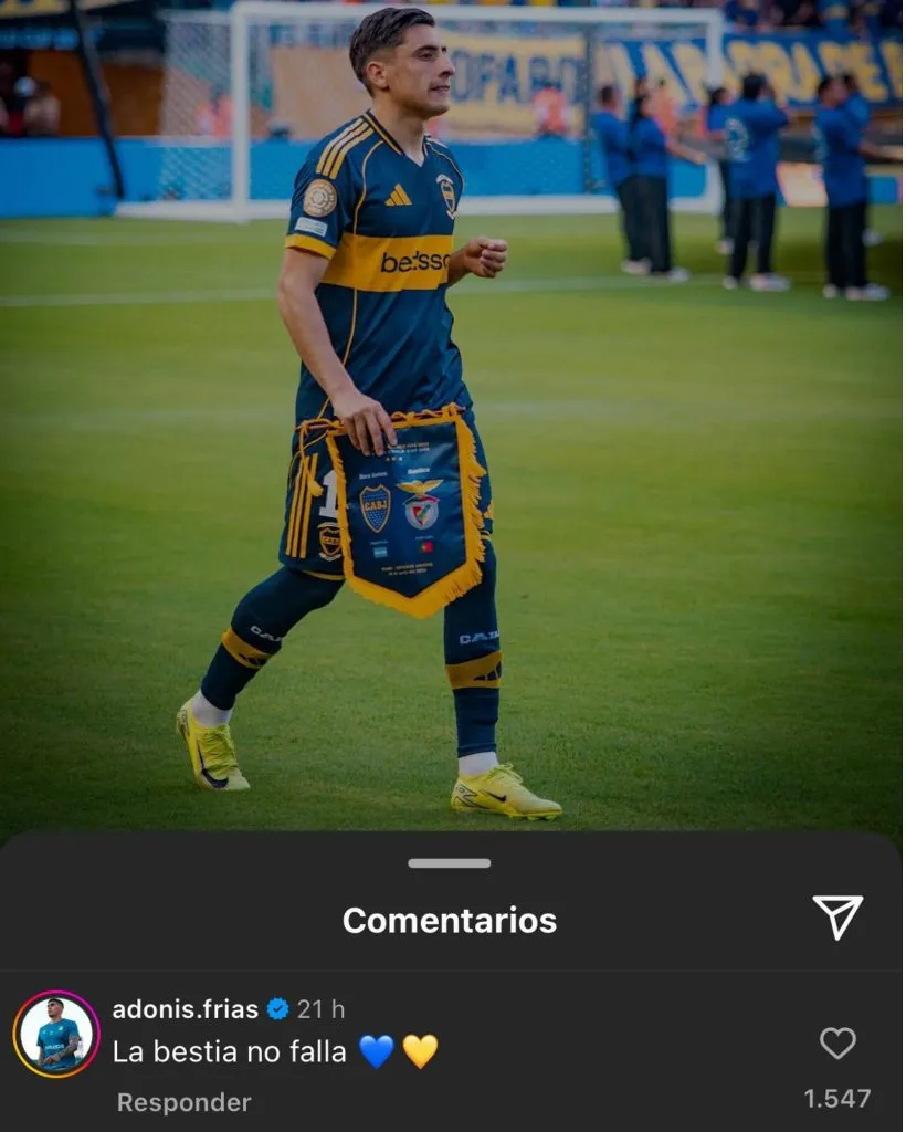 Tras ello, mientras el plantel se prepara para el siguiente compromiso, el delantero uruguayo publicó una serie de fotos del debut del Xeneize. Allí, Adonis Frías no tardó en comentarle el posteo con la frase “la Bestia no falla” y corazones de color azul y oro. Cabe recordar que los futbolistas son amigos y coincidieron en Defensa y Justicia.