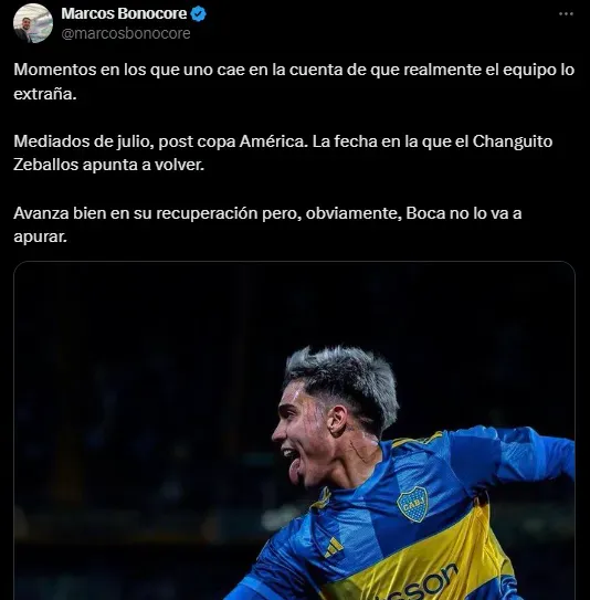 Si bien han trascendido escasos nombres que busca Boca para el mercado venidero, en la Ribera ya saben que contarán con un “refuerzo” que se encuentra dentro del plantel y que podrá ser parte del equipo a partir del semestre entrante. Esto se debe a que Exequiel Zeballos estará disponible para el inicio de la Liga Profesional, torneo que tendrá su inicio luego de la Copa América 2024.