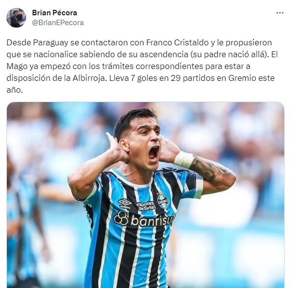 Según informa el periodista Brian Pécora, desde Paraguay se contactaron con Franco Cristaldo, actualmente jugador de Gremio, y le propusieron que se nacionalice sabiendo de su ascendencia, ya que su padre nació allá, por lo que el volante ofensivo de 26 años empezó con los trámites correspondientes para estar a disposición de la Albirroja.