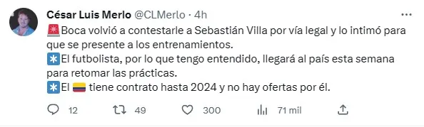 Desde La Ribera se comunicaron con el jugador por la vía legal, enviando más de una carta documento para exigirle explicaciones por su salida del país sin previo aviso y dejándole en claro que debe retomar sus entrenamientos con Boca, a pesar de que no será tenido en cuenta. Villa tiene contrato con el club hasta diciembre de 2024 y no hubo equipo que se haya acercado para intentar comprar su ficha, por lo que debe cumplir con lo que resta del vínculo.