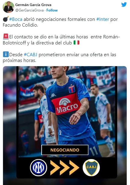 “Boca abrió negociaciones formales con Inter por Facundo Colidio. El contacto se dio en las últimas horas entre Román (Riquelme), Bolotnicoff y la directiva de club italiano”, publicó el experto en el mercado de pases a través de su cuenta de Twitter. El delantero que volvió a Italia tras su exitoso paso por Tigre despertó el interés del Xeneize, que estaría enviando una propuesta económica en las próximas horas.