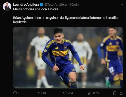 Es que tras su lesión en el partido ante Talleres por Copa Argentina, Brian Aguirre sembró preocupación en el Mundo Boca debido a que sintió una dolencia en su rodilla. Y a pesar de que se descartó lo peor -una rotura de ligamentos- el santafecino que arribó desde Newell’s en el último mercado de pases quedó descartado para el Superclásico.
