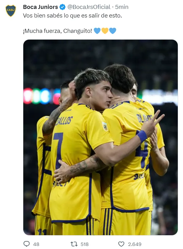 La cuenta oficial del club de la Ribera le dedicó un posteo al delantero luego de compartir su parte médico. “Vos bien sabés lo que es salir de esto. ¡Mucha fuerza, Changuito!”, escribió.