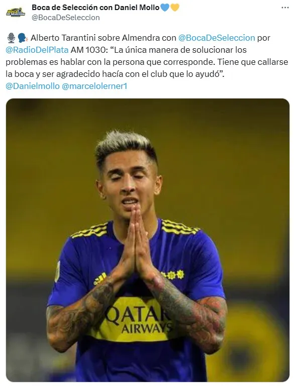 Sin respuesta del Pipa hasta el momento, quien cruzó a Almendra fue ni más ni menos que un campeón del mundo con la Selección Argentina. “La única manera de solucionar los problemas es hablar con la persona que corresponde”, señaló Alberto Tarantini en diálogo con el programa radial Boca de Selección.
