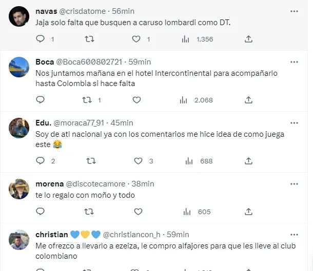En las redes sociales, los hinchas del Xeneize respondieron a esta oferta sobre el delantero de 28 años y no dudaron en aceptar la propuesta. “Te lo regalo con moño y todo”, “Nos juntamos mañana en el hotel Intercontinental para acompañarlo hasta Colombia si hace falta”, fueron algunos de los comentarios.