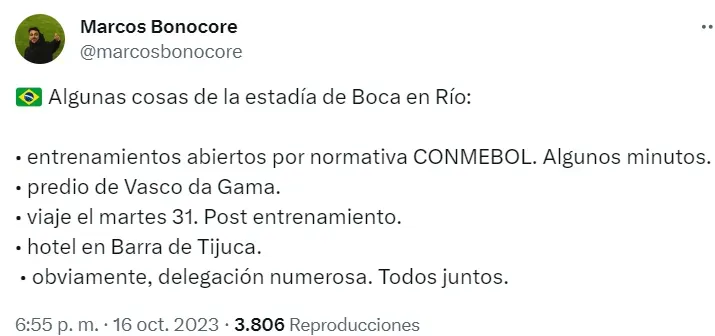 El periodista Marcos Bonocore fue dando a conocer varios detalles del viaje del Xeneize. El plantel concentrará en Barra de Tijuca y se entrenará en el predio de Vasco da Gama. Por reglamento de CONMEBOL, dos de esas prácticas deberán ser a puertas abiertas a la prensa. Cada vez falta menos para el día más esperado.