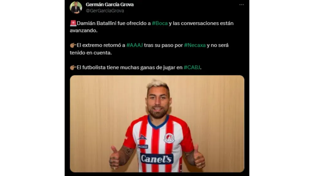 Sin embargo, en las últimas horas desde Boca también se habría agilizado por otro futbolista en esta posición que fue ofrecido recientemente desde su club actual. En concreto, hablamos de Damián Batallini. El extremo derecho de 27 años rescindió su préstamo en Necaxa de México y regresó a Argentinos Juniors, donde no es tenido en cuenta por el esquema de juego que plasma Gabriel Milito en donde no utiliza wings en su equipo.