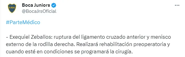 “Exequiel Zeballos: ruptura del ligamento cruzado anterior y menisco externo de la rodilla derecha. Realizará rehabilitación preoperatoria y cuando esté en condiciones se programará la cirugía”, explicó la cuenta oficial de Boca.
