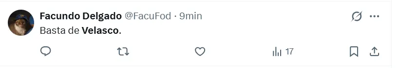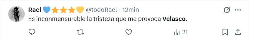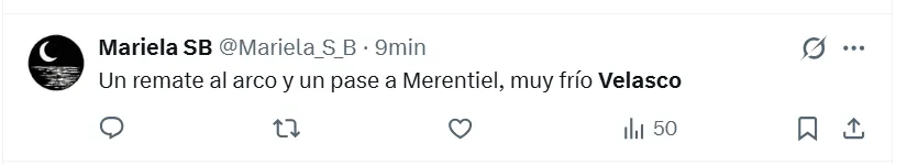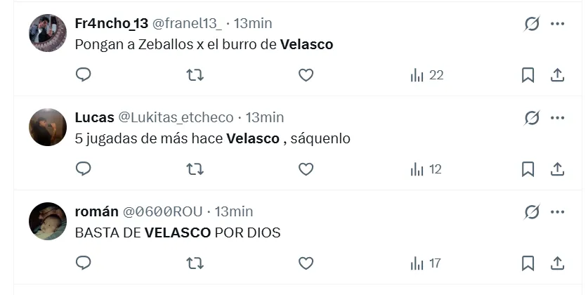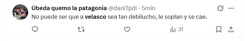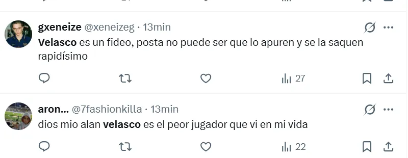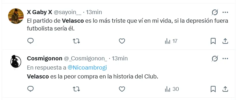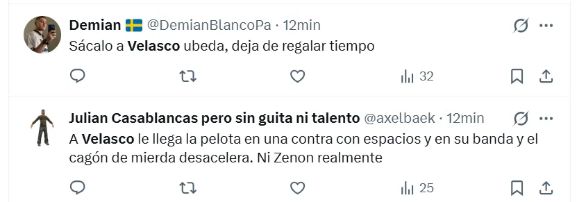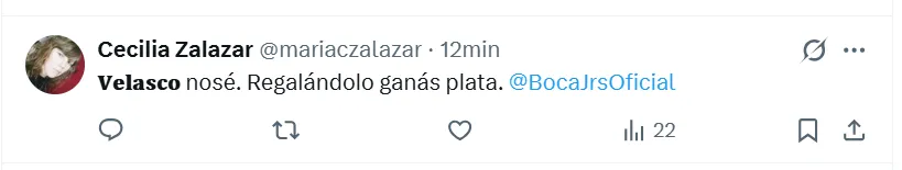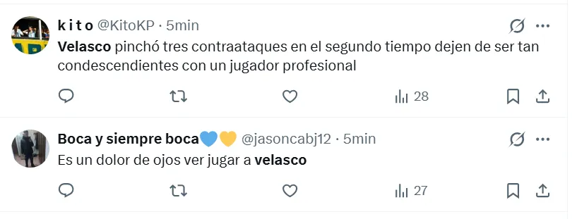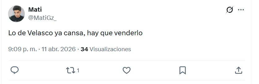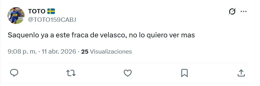 Las estadísticas no mienten y arrojaron que Velasco recibió 3 infracciones, perdió 14 pelotas y tuvo un 77% de precisión en los pases, un tanto por debajo de lo esperado para un futbolista de su jerarquía y el cual Boca lo pagó 10 millones de dólares. Por ese mismo motivo, uno de los hinchas apuntó contra su partido y dejó un comentario destacado en X (ex Twitter). “Hay que venderlo“, sostuvo.