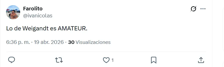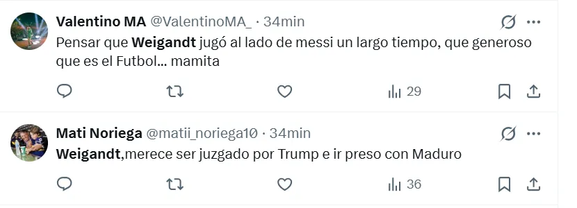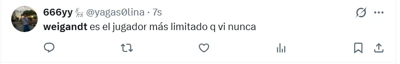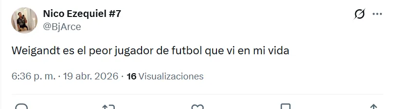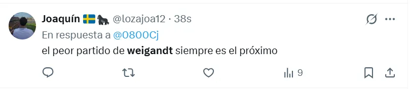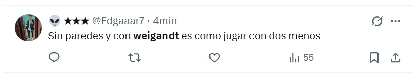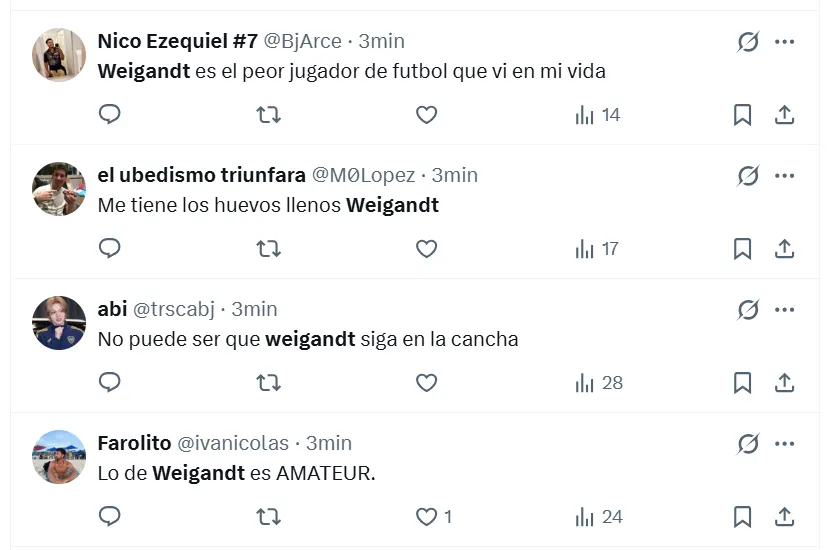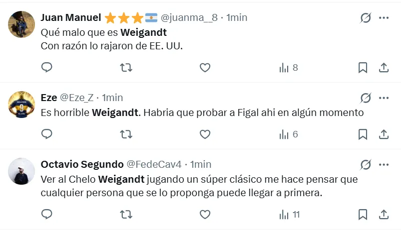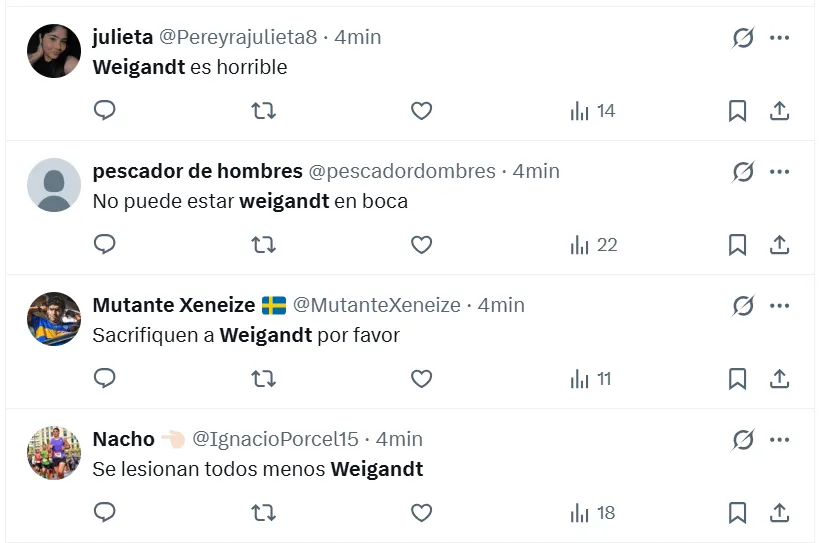 Lo cierto es que, durante el encuentro estelar del semestre, los hinchas de Boca arremetieron contra Marcelo Weigandt. A pesar de la victoria por 1-0 en el Superclásico, no perdonaron el rendimiento individual del lateral derecho y se expresaron a través de las principales redes sociales. “Es un hueco en el equipo, es uno menos”, manifestó uno de los simpatizantes en X (ex Twitter).