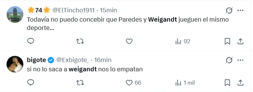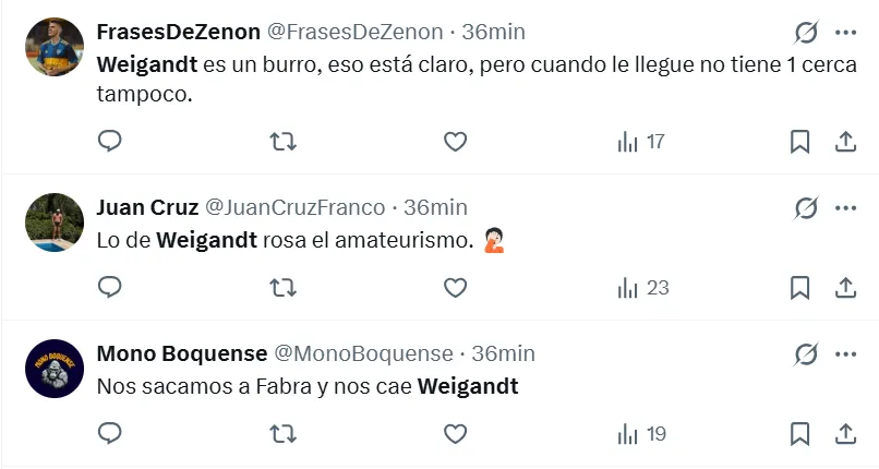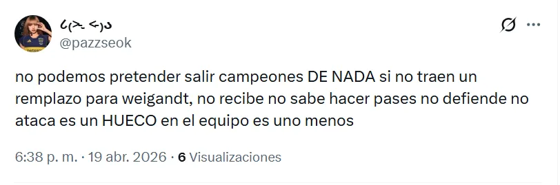 En la misma línea que el posteo mencionado anteriormente, hubo otros que destacaron en las redes sociales. “Es el peor jugador que vi en mi vida“, “es amateur”, “me hace pensar que cualquier persona que se lo proponga puede llegar a Primera”, “es como jugar con dos menos“, “roza el amateurismo”, agregaron los simpatizantes de Boca.