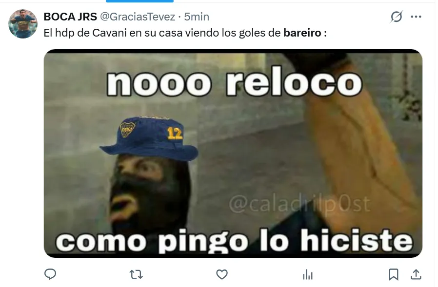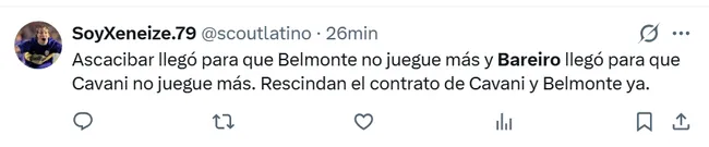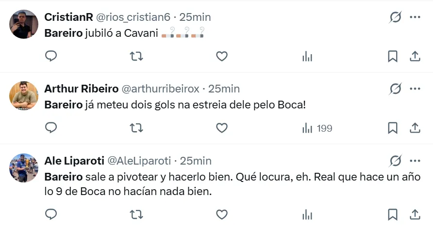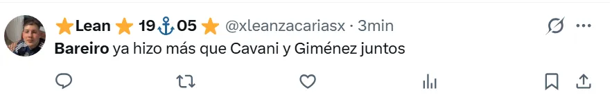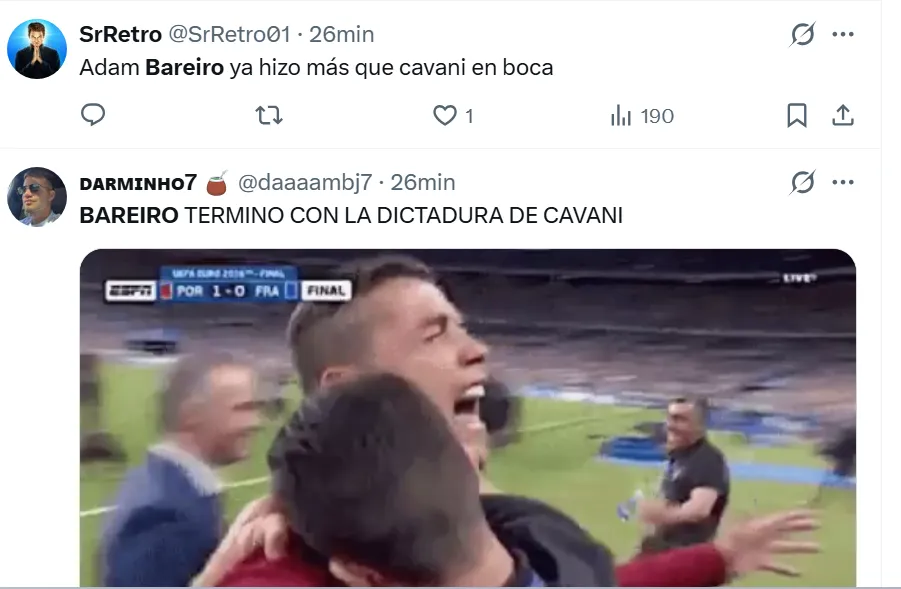 “Lo jubiló a Cavani”, “Hace un año que un 9 de Boca no hacía todo bien”, “Bareiro llegó para que Cavani no juegue más”, “Ya hizo más que Cavani en Boca”, “Demostró que es más que Cavani”, “Bareiro es jugador para Boca”, fueron algunos de los comentarios bancando al paraguayo.