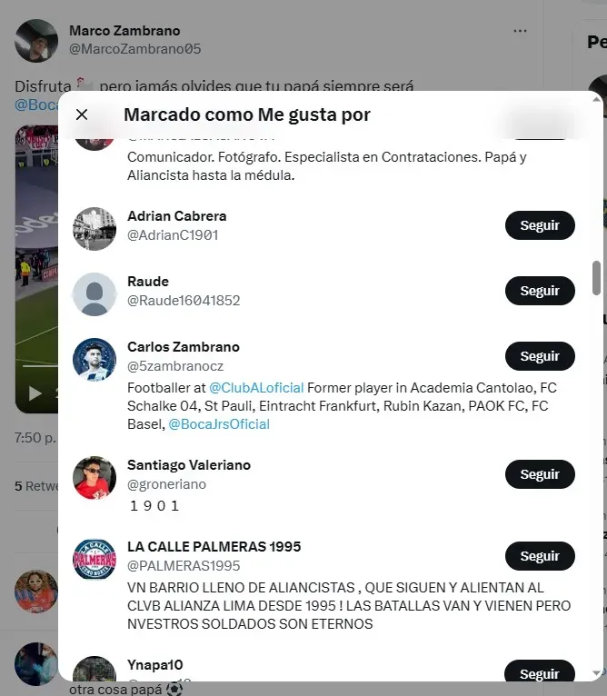 “Disfruta gallina (con un emoji), pero jamás olvides que tu papá siempre será Boca Juniors”, fue el posteo que hizo el hermano del jugador de Alianza Lima en la tarde-noche del domingo. Luego, Zambrano le dejó su “me gusta” en la publicación y hasta el día de hoy se puede ver en su perfil de Twitter. ¡Picante!