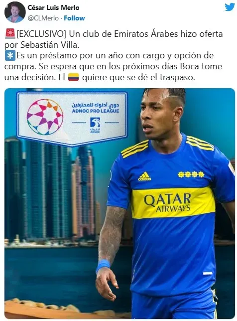 Así lo confirmó de manera exclusiva el periodista César Luis Merlo por la mañana del miércoles. “Un club de Emiratos Árabes hizo oferta por Sebastián Villa”, posteó en su cuenta oficial de Twitter para dar a conocer la propuesta que recibió Boca en las últimas horas. La misma sería a través de un préstamo con cargo y una opción de compra cuyas cifras no trascendieron.