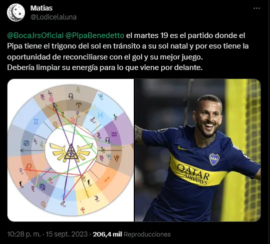 El tarotista que utiliza el usuario @lodicelaluna en Twitter, expresó el 15 de septiembre (4 días antes del partido entre Boca y Central Córdoba) lo siguiente: “El martes 19 es el partido donde el Pipa tiene el trigono del sol en tránsito a su sol natal y por eso tiene la oportunidad de reconciliarse con el gol y su mejor juego. Debería limpiar su energía para lo que viene por delante“. Resumidamente, el astrólogo sentenció que el gol de Benedetto podría revertir su irregular presente, junto a una semana del duelo ante Palmeiras por las semis de la Copa Libertadores y una fecha del Superclásico.